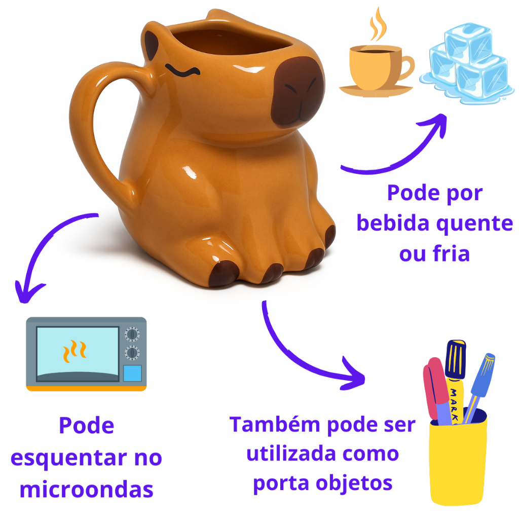 A Caneca Capivara é uma excelente opção de presente para amigos e familiares que apreciam itens divertidos e exóticos. Sua altura de 11,5 cm e o alto relevo tornam-na uma peça de destaque em qualquer coleção. Adicione um toque de alegria e personalidade à sua rotina com esta caneca que é mais do que um simples utensílio.