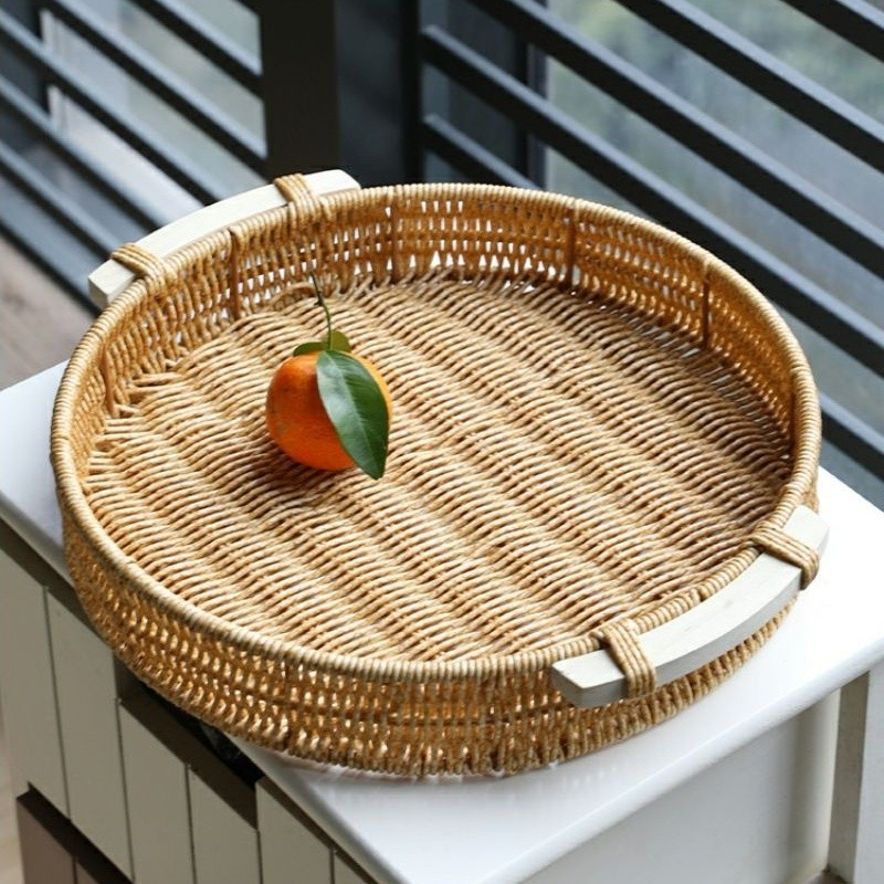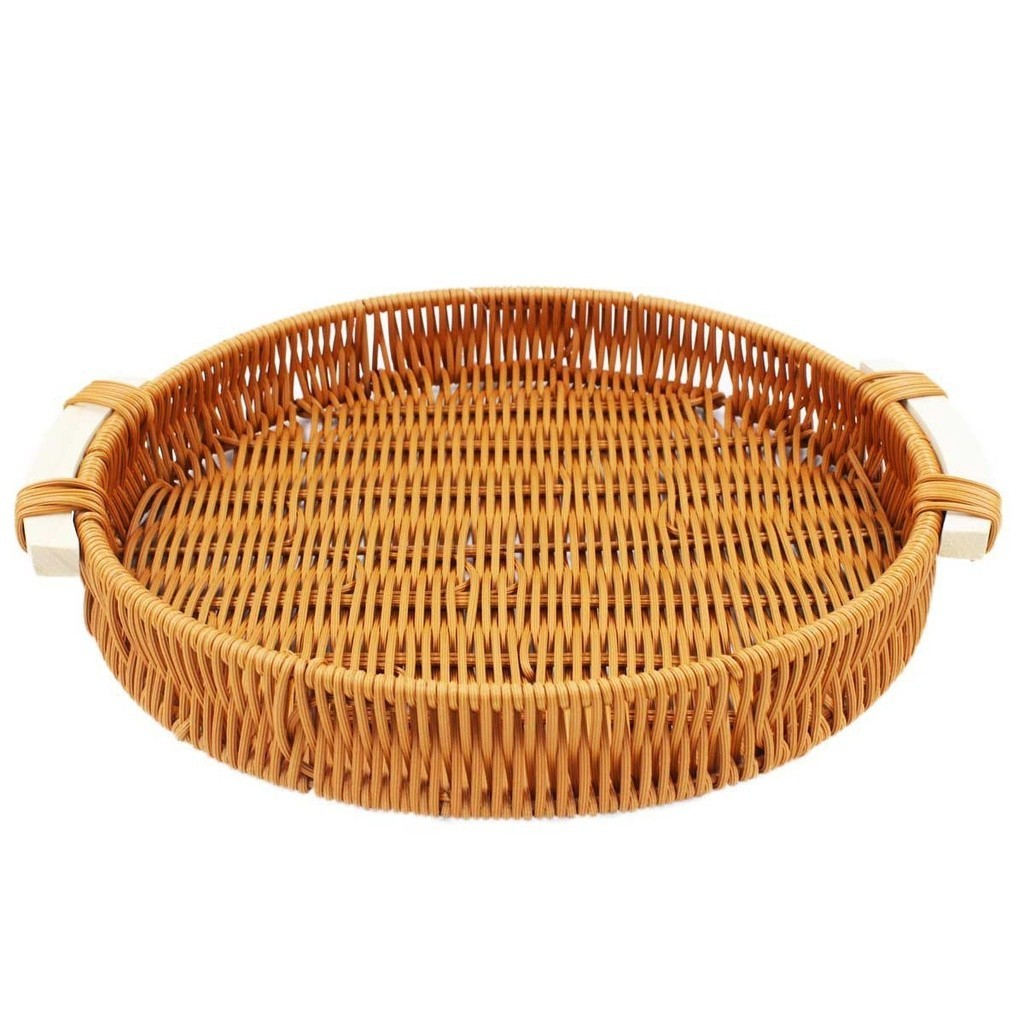 Bandeja de rattan de imitação Sala de estar Bandeja de chá Restaurante Bandeja de pão Cesta de armazenamento, tecido à mão, material semelhante ao rattan, cesto multiuso, tecnologia tecida à mão, mostrando a beleza da natureza, a sensação geral é suave, sem farpas não arranham as roupas , design de alça de madeira, aderência confortável, a alça é calma e elegante, suportada pela armação de metal da borda, não é fácil de deformar, durável, firme e bonita.