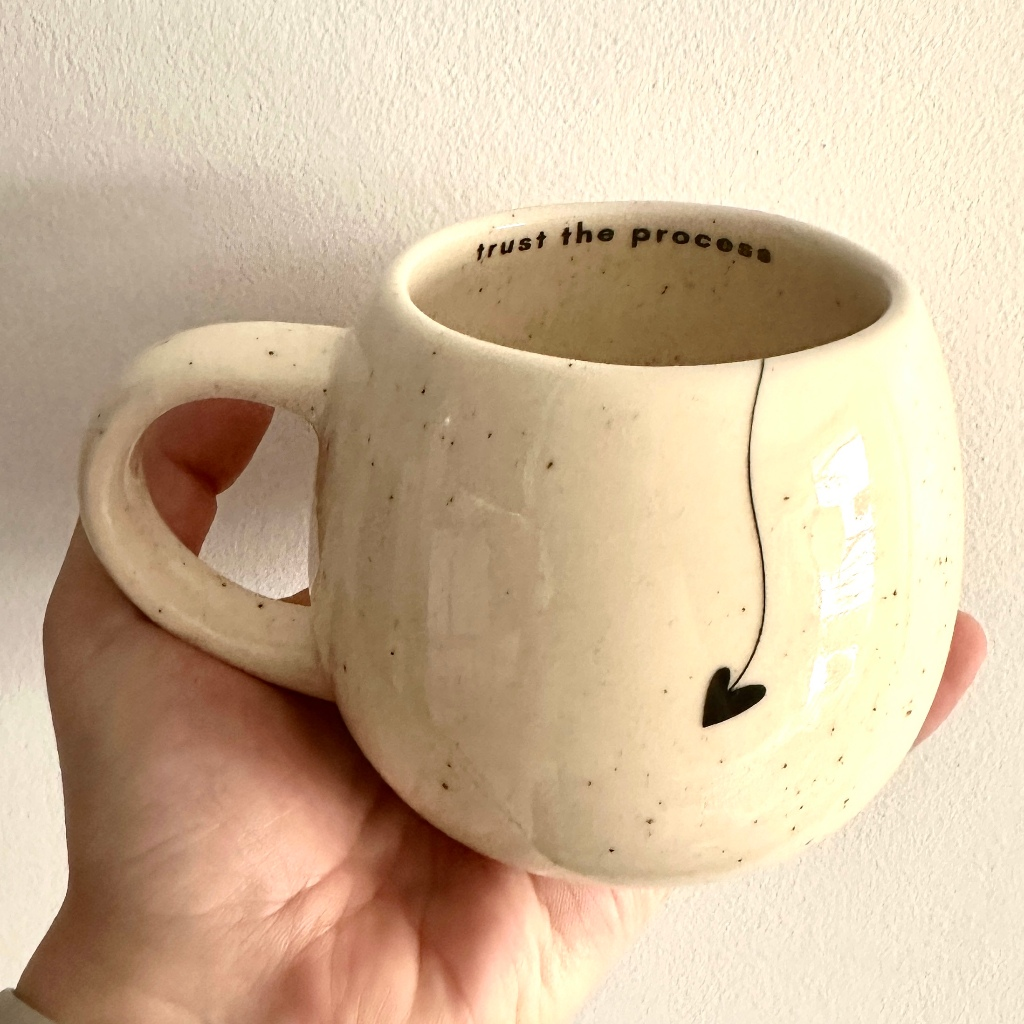 - Caneca Trust the process (com chá coração e mensagem surpresa no fundo) cor areia